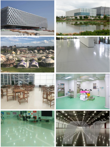 無機自流平地面,彩色磨石地坪,食品車間地坪、牲畜養殖地坪、垃圾轉運站地坪(耐有機酸侵蝕)。